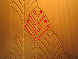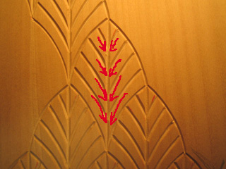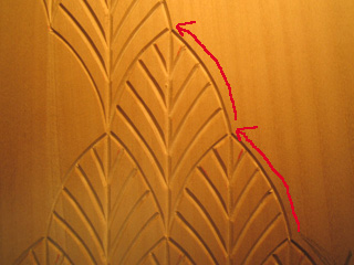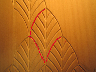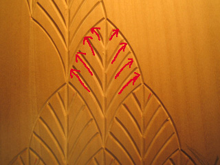 真ん中の線より先にこっちを彫っておいたほうが曲線の合わせ目がきれいに彫れそう。2月02日(月) 5.真ん中の線を浅く入れる。 2月02日(月) 6.深くする。 2月02日(月) 7.4本線を深くする。