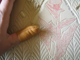 左の親指の爪で刀を押す癖があるので、深彫りを急ぐ場合は良いガードになる。