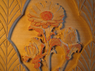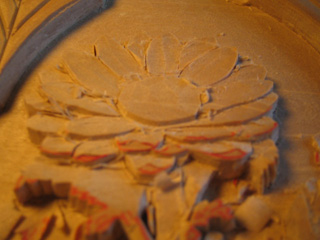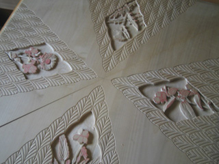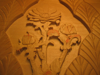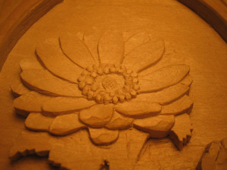 花びらもざっと彫る。5月16日(日) 花びらを彫っていくには花心を決めないと進まないので、花心を小さい丸刀で立て込むことに決める。
