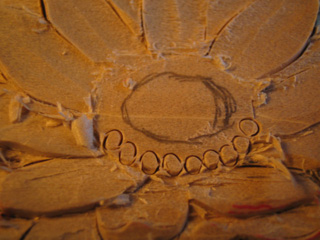 アザミはだいたい高低の境界がつけてあるので、同じ板のフクジュソウからとりかかろう。5月16日(日) 先に花とつぼみを仕切って軽く高低をつける。 5月16日(日) 花をもう一段階進める。花心はまわりより低く、そして遠くを低く。