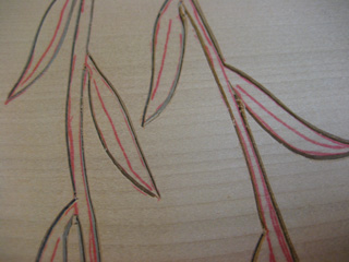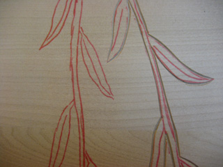 まず三角刀で輪郭線を浅く彫る。
