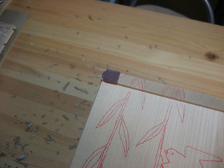 革の指サックを左手親指に。7月27日(日) 箱物なので上部を彫るときは立って彫る。