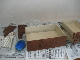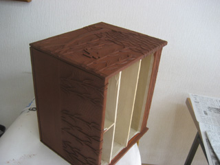 2009年 柳の四ツ引制作過程 その11 5月10日(日) 彫っていないところに サンドぺーぺーをかける 5月10日(日) 塗りの境に マスキングテープを貼る 5月10日(日) まず砥の粉を塗り 次に ポアステインの マホガニーブラウンを 薄めずに塗った 一息おき ウレタンを塗る 5月10日(日) マスキングテープは 細くても優秀 しかし貼るところが多い そして 引き出し4つ 囲い板3枚 リモコンラック ラック内板2枚 つばめ8個 と部品多し
