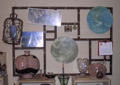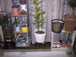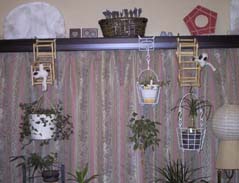 小さなS字フックで 小さなワインラックを下げ、そこに草を下げた。白いワイヤーの方はチューブスタンドを使った。これらは、つり下げる時、手前に張り出すので都合がよい。