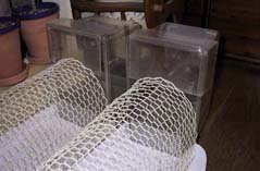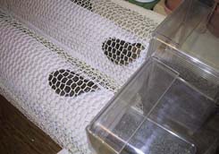 長い板にチキンネットと言われる金網を張った。キッチンペーパーを敷いている。鳥かごの出入り口は餌入れの部分を少し切って広げ、踏み台を付けて連結可能にした。うずがちびの羽を抜いたり、ちびがうずの頭をとっつかまえることがあるようになったので、2セット作った。