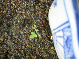 小鉢を寄せてある砂場に出た芽。