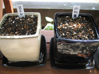 スミレと小松菜の種を蒔いた鉢も置けたし