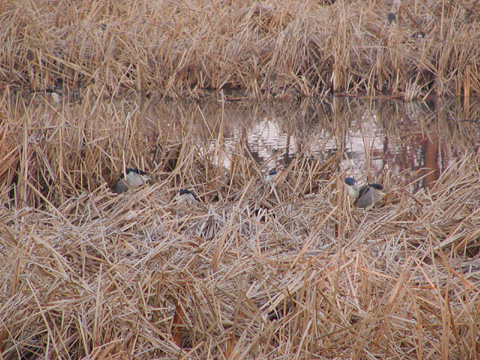12月15日(日) よく見ると草むらにゴイサギ。 ちょっとピンぼけだが、みんなこっちを見ているのがわかる。