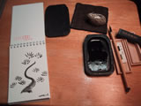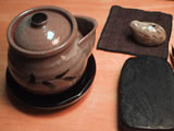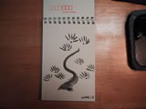1月2日(木) そうだ今日は書き初めの日だったじゃないかと夜中に気づく。 せっかくなので、ほったらかしにしてあった硯と墨を使ってみる。 うずらの水滴も使ってみる。 しかし紙は、はがきサイズのスケッチブックである。 右は唐津の土瓶。お茶がうっすら漏れるので、大きい茶托を土瓶敷きがわりに買った。