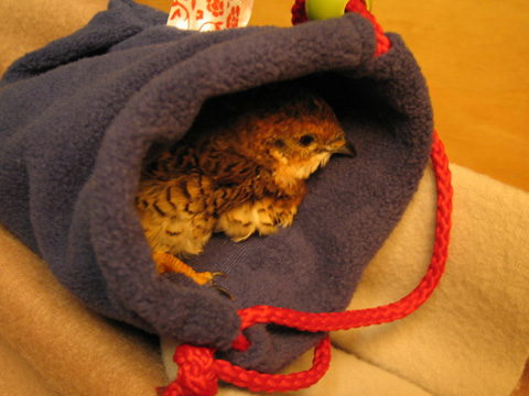 3月24日(水) ケースの敷きフリースを替えるとき、ちびを袋に入れてみた。 落ち着いている。気に入ってる様子だ。びっくり。 いつもは砂浴びケースに入れておいて掃除をするのだけど 今日は砂場がいやそうだったので、袋に入れることを思いついたのだ。 鶉の鳴き合わせが流行っていた江戸時代には、 鶉を袋に入れて腰からさげて持ち歩き時々かまってやっていたというので やってみたかったのだ。 今日は、この袋を首からさげてケースの掃除をした。