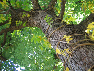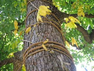 ものすごい勢いで藤にからまれている桜。