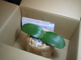 箱の真ん中にぽつんと詰め物もなしで入っていた。よく見ると透明のガムテープで4カ所がっちりと留めてあるのだ。十分で無駄のない保護である。
