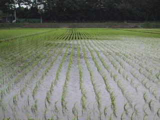 遠くの稲の緑は